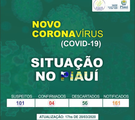 A Secretaria de Estado da Saúde divulgou, na tarde desta sexta-feira (20), um novo boletim em que o número de casos confirmados do novo coronavírus no Piauí subiu para quatro. No total, foram 161 casos notificados, sendo 56 deles já descartados. Outros 101 continuam como suspeitos.