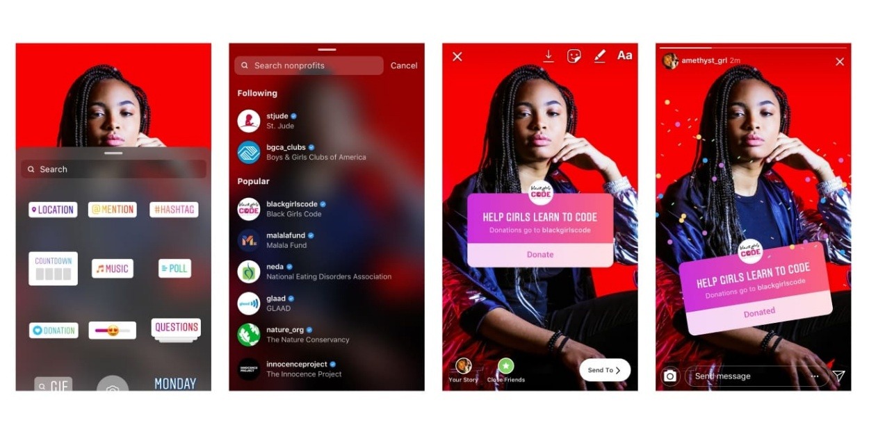 O adesivo de doação foi mencionado pela primeira vez no Facebook Communities Summit, em fevereiro, mas só agora passa a estar disponível nos Estados Unidos. Com isso, os usuários poderão usar o novo adesivo para angariar fundos apenas para organizações sem fins lucrativos, como a Black Girls Code e a Malala Fund, apenas algumas das ONGs citadas como exemplos pelo Instagram.