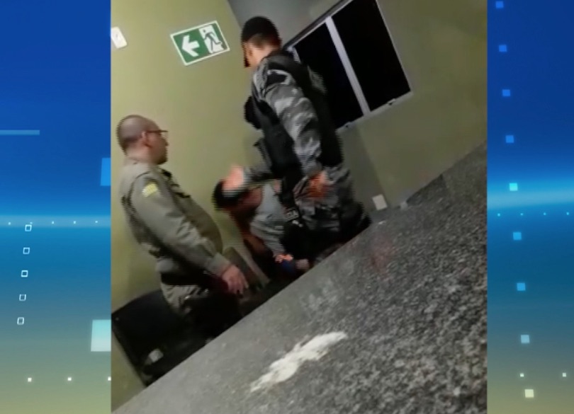 Ao ser conduzido para dentro da delegacia, o suspeito de furto foi torturado e agredido por dois policiais. Nas imagens, é possível ver o acusado sentado e algemado sendo brutalmente espancado pelos PM’s.