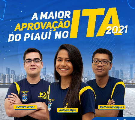 A maior aprovação do Piauí no ITA 2021 é composta pelo trio de estudantes Objetivos, os alunos Hermiro Júnior, Rafaela Myla e Matheus Rodrigues.