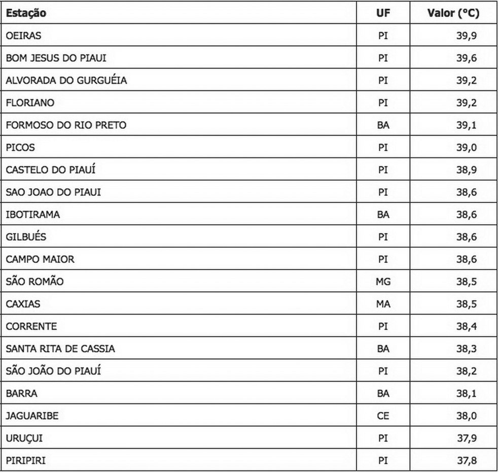 Conforme o Inmet, a temperatura em Oeiras atingiu uma média de 39,9 °C. O segundo, terceiro e quarto lugar do ranking também ficam no estado: Bom Jesus do Piauí (39,6 °C), Alvorada do Gurguéia (39,2 °C) e Floriano (39,2 °C). Nesta terça-feira (8), Bom Jesus ficou em primeiro lugar na lista.