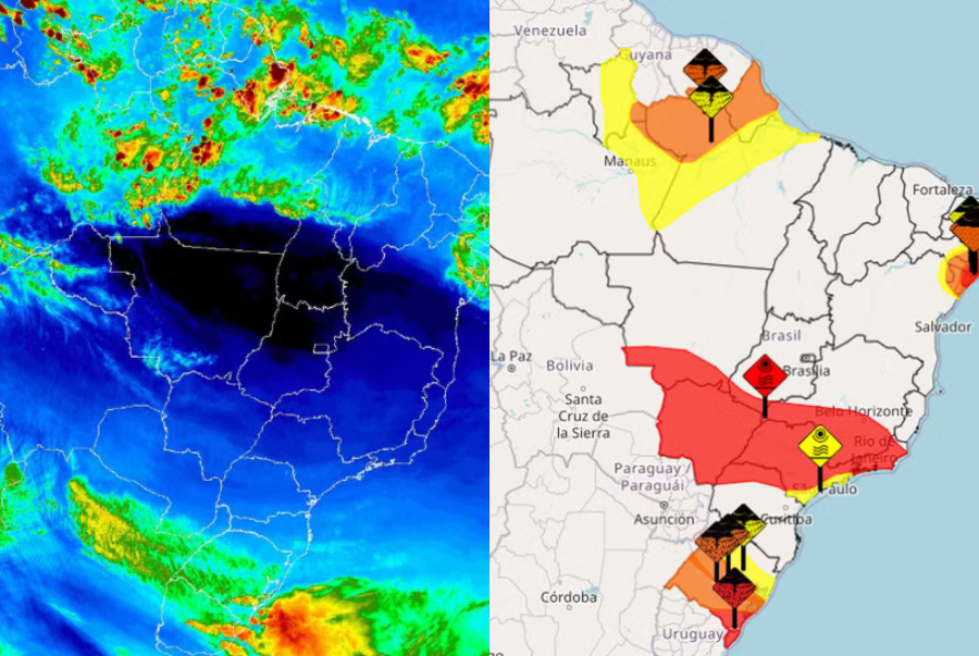 DEMAIS REGIÕES: O número de mortes devido às chuvas no Rio Grande do Sul já chega a 95, com 131 desaparecidos. A região Sudeste, por sua vez, enfrenta uma onda de calor com alerta de "Grande Perigo" para altas temperaturas no Rio de Janeiro, São Paulo, Espírito Santo e Minas Gerais. O Norte do Brasil também está em alerta de "Perigo" para chuvas intensas no Amazonas, Amapá e Roraima. O Inmet mantém os alertas até quinta-feira.