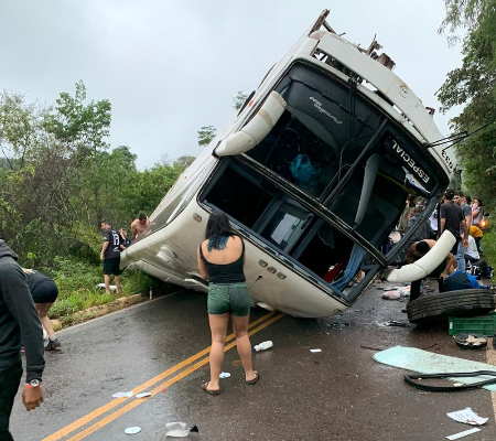 Quarenta e dois passageiros ficaram feridos - dois em estado grave - no tombamento de um ônibus no km 416 da BR-259, no Serro, na Região Central de Minas Gerais, na madrugada desta segunda-feira (18). No veículo havia 51 pessoas. De acordo com o Corpo de Bombeiros, o motorista informou que o coletivo teve problemas no freio, ganhou velocidade e virou. As informações são do G1.