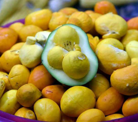 Conhecido como "Ouro do Cerrado" devido à polpa amarela, o fruto dos pequizeiros tem o tamanho aproximado de um abacate e também uma casca verde. Embaixo da polpa amarela, macia e comestível, porém, há uma camada de espinhos muito finos e perigosos. O pequi ficou com uma fama negativa no Senado Federal, no início dos anos 2000, por conta de um almoço do então senador Saturnino Braga (PSB-RJ), ex-prefeito do Rio de Janeiro, em Pirenópolis (GO), onde foi servido frango com pequi.
