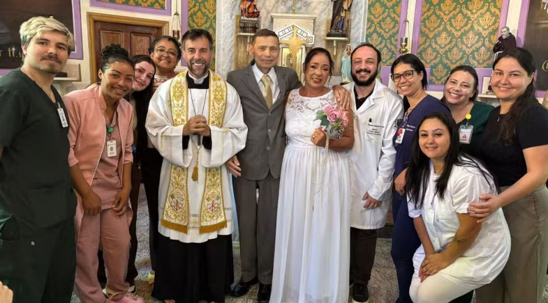 A cerimônia foi realizada na capela da unidade de saúde e contou com o apoio de funcionários do hospital, que ajudaram na organização, providenciando itens como alianças, bolo e decoração. Após o momento religioso, o casal assinou os documentos que oficializaram a união ainda no local.