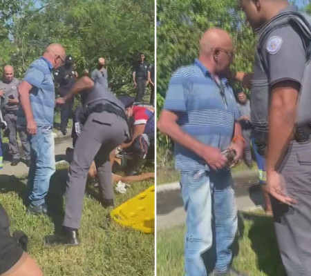 A Polícia Civil confirmou que o homem que aparece nas imagens é o pai do rapaz baleado e detido. No vídeo, que repercutiu nas redes sociais, o pai é contido por um Policial Militar, para que não avance sobre o rapaz que está recebendo os primeiros socorros após ter sido baleado.