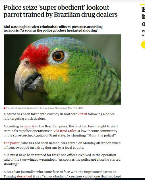 O site The Guardian fez uma matéria sobre o animal que gritou ‘’Mamãe, polícia’ ao perceber a entrada de policiais militares na casa que funcionava como boca de fumo na Vila Irmã Dulce, zona Sul de Teresina. Um homem foi preso e uma menor apreendida no local.