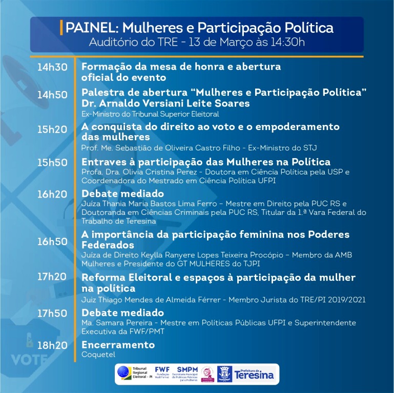 “A conquista do direito ao voto e o empoderamento das mulheres” será o tema de um painel com o ex-ministro do Supremo Tribunal de Justiça, Sebastião de Oliveira Castro Filho, nesta sexta-feira (13). O evento acontece a partir das 14h30, na sede do Tribunal Regional Eleitoral do Piauí (TRE-PI), que apóia a realização do evento promovido pela Fundação Wall Ferraz (FWF), a Secretaria Municipal de Políticas para Mulheres (SMPM) e o Conselho Municipal de Direitos da Mulher.