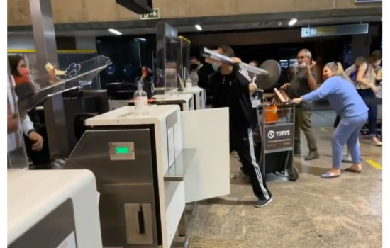 Na sequência, um homem surge segurando um pedestal, usado para fazer a separação das filas, e usa o objeto para quebrar parte da proteção do guichê. “Eu quero que resolva, meu filho só tem cinco meses! Resolve. A menina falou para mim tem duas horas. O meu menino não tem que pagar por isso, quero alguém resolvendo aqui agora. Quero a polícia, o menino não tem culpa”, grita o homem.