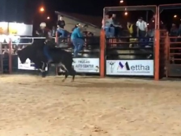 Logo após sair da porteira, ele é arremessado pelo animal durante um movimento. Antes de chegar ao solo, o atleta bate a cabeça na região cranial do touro e perde o equipamento de proteção individual. Thiago é resgatado já desacordado.