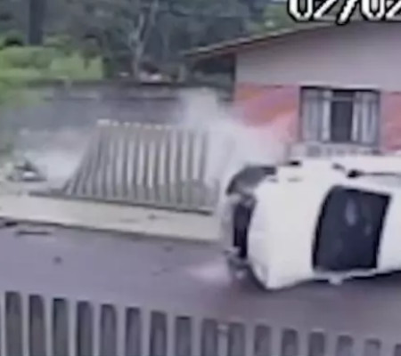 As imagens registradas no bairro Ferraria, em Campo Largo, são impressionantes. Logo após uma curva, um automóvel branco perde o controle, quase atropela um pedestre, bate em um muro e capota. O vídeo causa ainda mais impacto pela agilidade do homem em escapar de um atropelamento e também pelo motorista sair sem ferimentos.