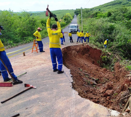No último sábado, no norte do estado, equipes do DER se dirigiram até a PI que liga a cidade de Pedro II a um dos pontos turísticos mais conhecidos da região, o Morro do Gritador, a fim de providenciar as intervenções necessárias depois que as chuvas abriram uma cratera que comprometeu metade da rodovia.