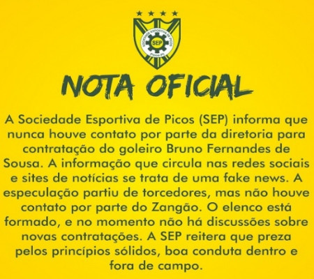 A sociedade Esportiva de Picos (SEP) informa que nunca houve contato por parte da diretoria para a contratação do goleiro Bruno Fernandes de Sousa. A informação que circula nas redes sociais e sites de notícias se trata de uma fake news. A especulação partiu de torcedores, mas não houve contato por parte do Zangão. O elenco está formado, e no momento não há discussões sobre novas contratações. A SEP reitera que preza pelos princípios sólidos, boa conduta dentro e fora de campo.