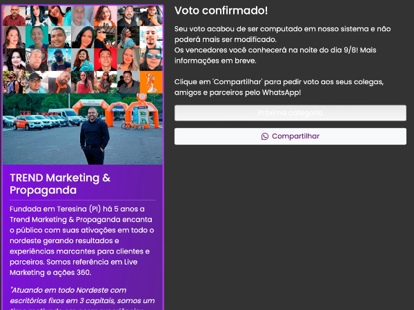 A Trend Marketing, empresa bastante conhecida na capital, já conta com 5 anos de experiência no mercado prestando serviço para as maiores empresas do Piauí, Ceará e Maranhão e é finalista em duas categorias do prêmio.