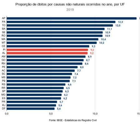Cerca de 9,2% das 18,4 mil mortes registradas no Piauí no ano passado foram motivadas por causas não naturais, como homicídios, suicídios, afogamentos e acidentes de trânsito. De acordo com Registro Civil 2019, do Instituto Brasileiro de Geografia Estatística (IBGE), o percentual do Piauí é o décimo maior do país, junto com o estado de Alagoas. No Brasil, cerca de 7,4% das 1,3 milhão de mortes ocorridas em 2019 foram provocadas por causas não naturais.