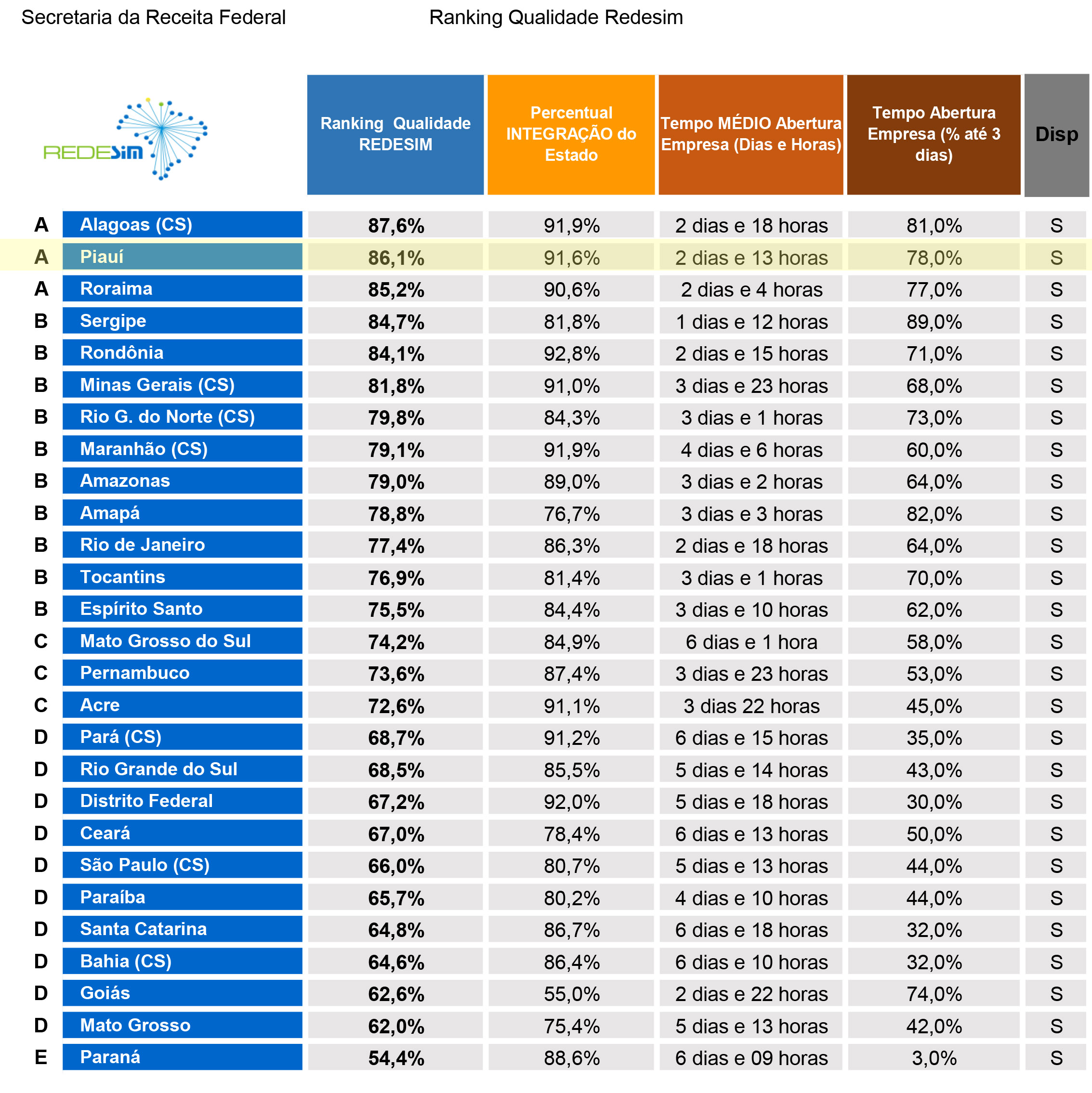 De acordo com dados divulgados no fim de janeiro pela Receita Federal do Brasil, o Piauí ocupa a segunda posição no Ranking de Qualidade da Rede Nacional para a Simplificação do Registro e da Legalização de Empresas e Negócios (Redesim). Nos últimos três meses, o Piauí alcançou uma pontuação de 86,1% no ranking, ficando atrás apenas de Alagoas, com 87,6%.
