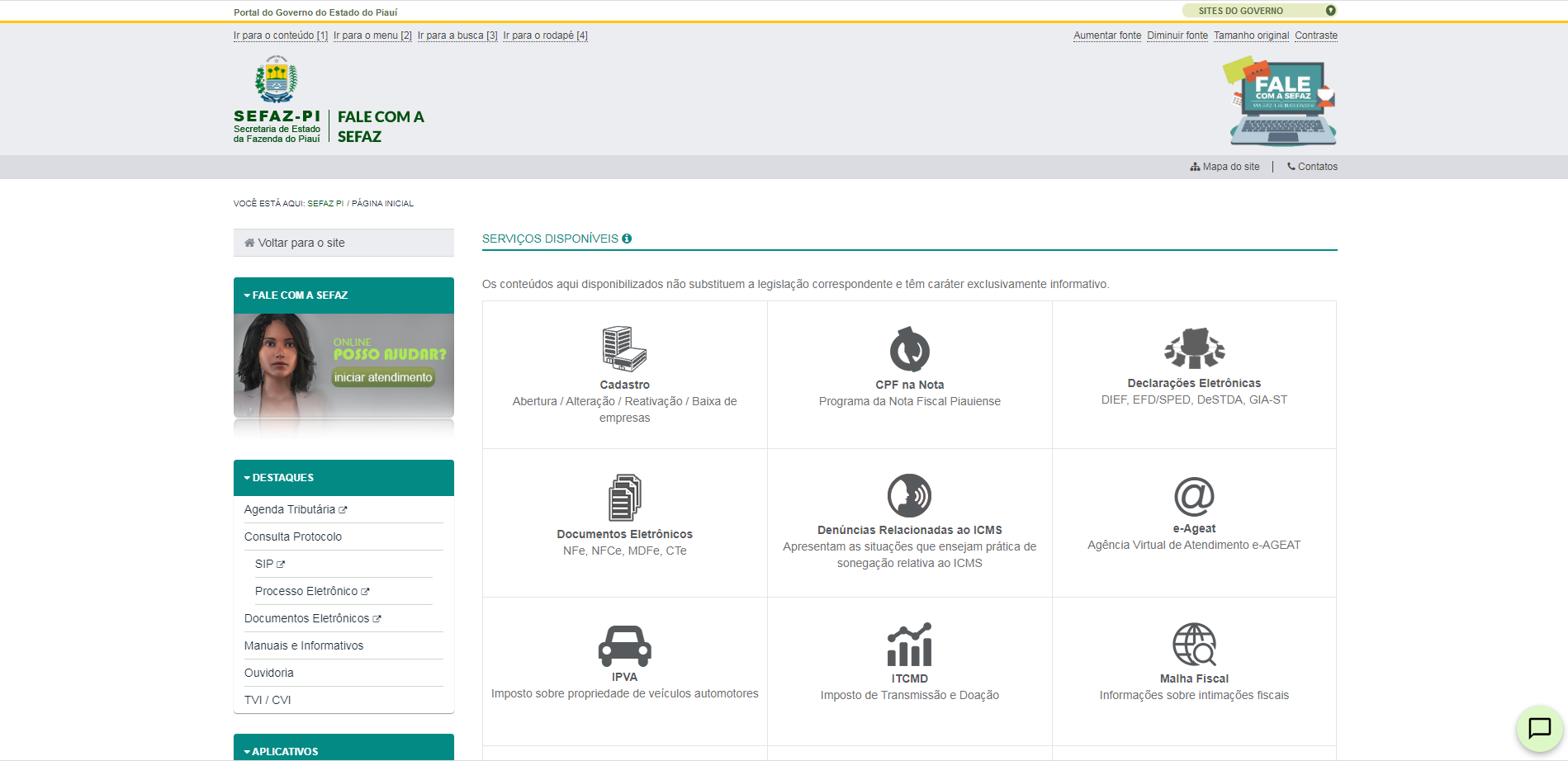 O site oferece inúmeros serviços, exceto o que necessita de protocolo de documentos. Mesmo assim, depois que o contribuinte dá entrada no protocolo, é possível acompanhar o andamento do pelo sistema SEI na página: http://portalsei.pi.gov.br/.