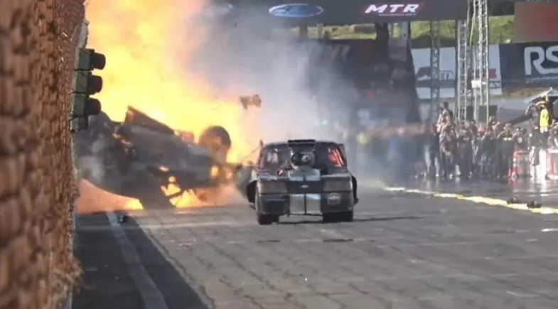 Carro balança após largada e capota antes de pegar fogo