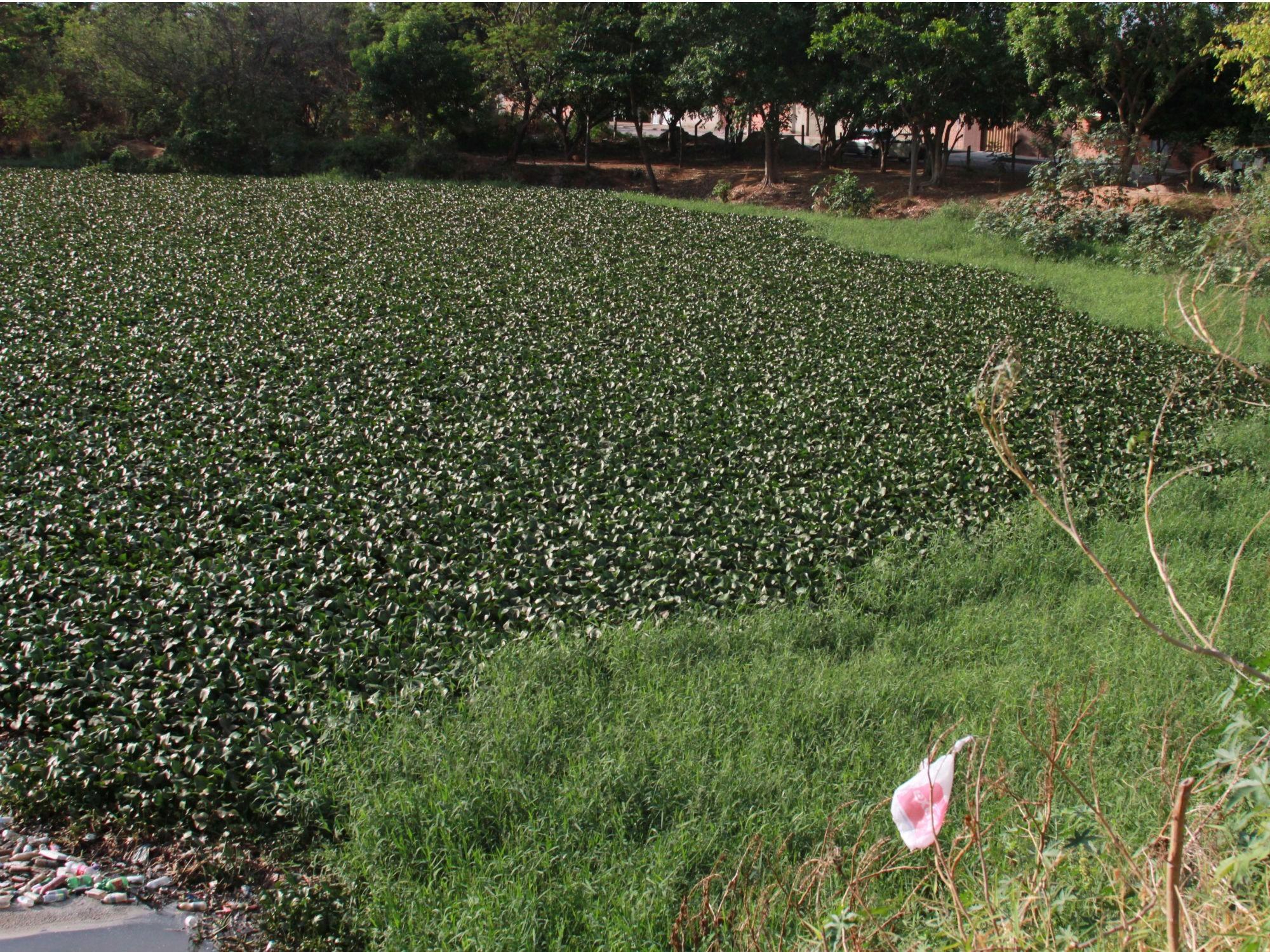 Em alguns pontos, é possível ver trechos em que as plantas cobrem completamente o rio. Além do acúmulo de lixo, como garrafas pet e sacolas de plástico, que levam anos para se decompor.