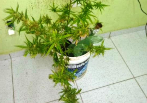 Foram apreendidos cinco pés de maconha, sendo dois plantados em vasos e três no quintal da residência.