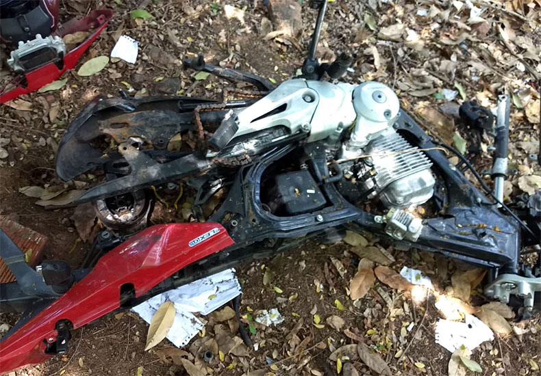 No local indicado pela denúncia, os policiais tiveram que entrar mais de 1 km dentro da mata para encontrar o ponto utilizado por criminosos. Lá foi encontardo uma motocicleta depenada.