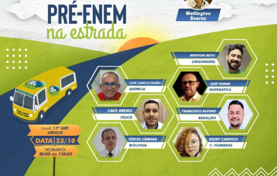 As revisões serão apresentadas pelos coordenadores do Pré-Enem, Wellington Soares e Viviane Carvalhedo. Nas revisões, os estudantes da rede terão acesso às aulas de Linguagens, com o professor Newton Neto; Química, com o professor José Carlos Feijão; Matemática, com José Osmar; Física, com Caio Breno; Redação, com Francisco Rufino; Biologia, com Tércio Câmara e Caio Frederico; e Ciências Humanas, com a professora Keury Campelo.