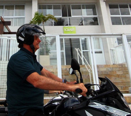 Durante o trajeto de moto e com o capacete solto, Bolsonaro parou em frente ao triplex que ocasionou a condenação do ex-presidente Lula por corrupção passiva e lavagem de dinheiro.