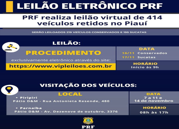 A Polícia Rodoviária Federal (PRF) no Piauí realizará leilão virtual de veículos retidos, abandonados, removidos ou recolhidos e que se encontram há mais de 60 dias nos pátios conveniados nos dias 16 e 17 de novembro de 2022, às 09:00h.