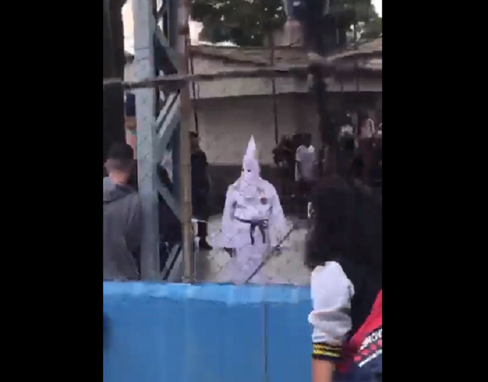 Na gravação, é possível ouvir a voz de uma jovem que parece ser aluna do colégio, incrédula com a vestimenta do professor, que remete ao grupo supremacista branco dos Estados Unidos.