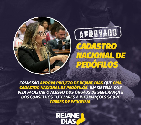 A Comissão de Segurança Pública da Câmara aprovou nesta quarta-feira, 30, um Projeto que cria o Cadastro Nacional de Proteção à Infância e à Juventude contra Pedófilos. Pelo Projeto, o cadastro deverá ser mantido, operado e alimentado pelos órgãos de segurança pública, pelo Ministério Público, pelo Poder Judiciário e pelos Conselhos Tutelares. A proposta consta no Projeto 2062/2019 de autoria da deputada federal Rejane Dias.