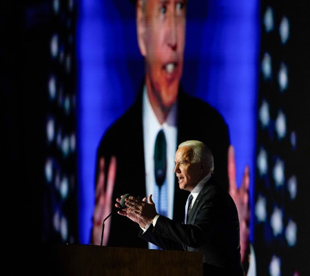 Biden, ao chegar para o discurso, foi recebido com um "buzinaço" — como medida preventiva contra o novo coronavírus, o evento ocorre em formato "drive thru". Ao iniciar a fala, ele agradeceu pela votação: 74 milhões de votos, um recorde na história dos EUA. "À minha equipe de campanha, aos voluntários, que deram tanto de si, para garantir que esse momento fosse possível. Eu devo a vocês, eu devo a vocês, eu devo a vocês tudo. A todos aqueles que nos apoiaram, tenho orgulho da campanha, da coalizão que construímos, a mais ampla e mais diversa da história: democratas, republicanos, independentes, progressistas, moderados, conservadores, jovens, velhos, urbanos, rurais, gays, latinos, asiáticos, heterossexuais, indígenas da América. Conseguimos. Eu quero dizer isso. Especialmente quando houve momentos mais difíceis a comunidade afroamericana esteve ali para mim. Sempre terão meu apoio. E eu terei o apoio de vocês", agradeceu.