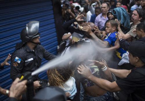 A Polícia Militar usou spray de pimenta e lançou bombas de efeito moral (com ação principal no barulho de sua explosão), segundo o comandante do 19º BPM, para conter tumulto na Avenida Nossa Senhora de Copacabana, uma das principais do bairro, que ficou interditada das 16h20 às 17h. Há informações de que a polícia também usou bomba de gás lacrimongêneo (provoca desconforto nos olhos e causa lágrimas e irritação na garganta). Manifestantes teriam jogado pedras em PMs e ordenado o fechamento do comércio.