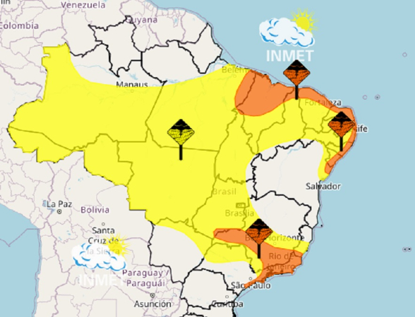 Nesses locais, o INMET emitiu alerta laranja (Perigo), pelos riscos provocados pela intensidade das chuvas que podem variar entre 30 e 60 milímetros por hora e acumulado de até 100 mm/dia. Os ventos podem chegar até 100 km/h.