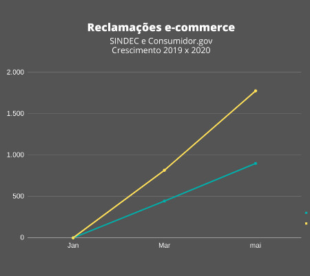 No Sindec, observa-se que de março a maio de 2020 foram registradas 48 reclamações sobre e-commerce, enquanto em 2019 foram 40, um aumento de 20%. No período de janeiro a março, os registros saíram de 56 em 2019 para 91 em 2020.
