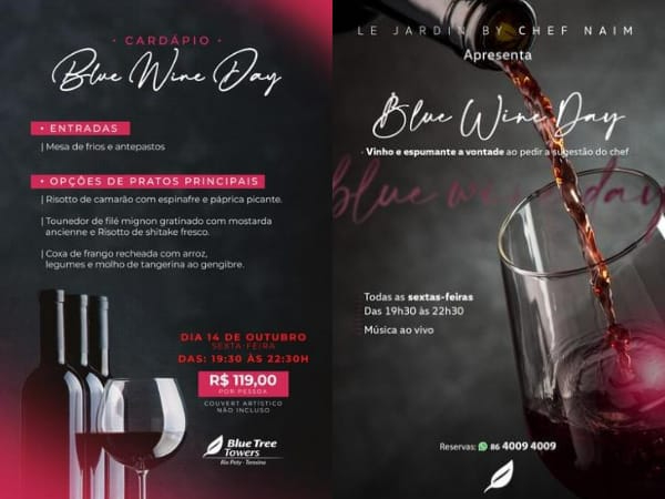 O gerente geral do hotel, Paulo Brito, anunciou que as sextas agora serão especiais no restaurante. “Apresentamos a noite Blue Wine Day, que funciona da seguinte forma: ao pedir o prato da sugestão do Chef, o vinho e o espumante serão por nossa conta das 19h30 às 22h30”, esclareceu.