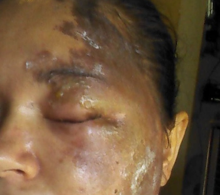 "Não queria vir porque era zona de risco. Quando eu cheguei lá, passei na frente de todo mundo, eles estavam com medo, não sabiam se eu tinha ficado cega, mas a médica disse 'não se preocupa, vai secar, vai cair e vir uma pele nova' e meu deu uma pomada. Quanto mais eu falo, mais me dói o rosto porque força o músculo".