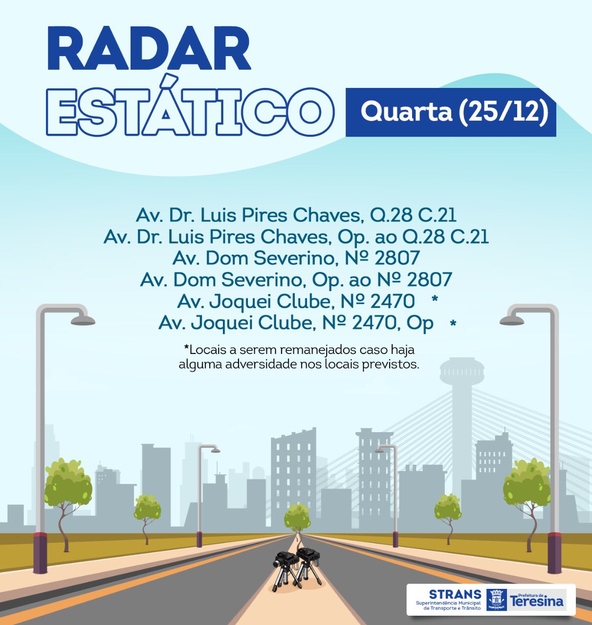 Nesta quarta-feira, feriado de Natal, a Strans instalou radares nas Avenidas Dr. Luis Pires Chaves, Quadra 25, Nº 21; Dom Severino, Nº 2807 e Jockey Clube, Nº 2470.