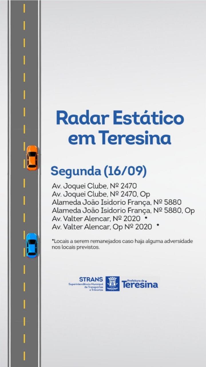 A Prefeitura de Teresina divulgou na manhã desta segunda-feira (16/09), a localização dos radares na capital. Para dar mais transparência aos teresinenses, a lista com a localização dos radares é sempre divulgada nas redes sociais, já que a presença dos aparelhos é importante para diminuir e prevenir o número de acidentes, assim como dar maior fluidez ao trânsito.