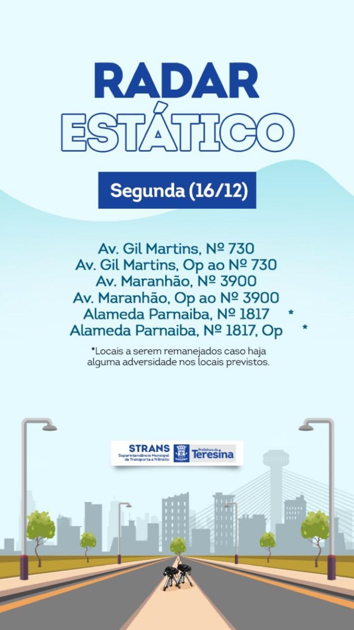 A Prefeitura de Teresina divulgou na manhã desta segunda-feira (16/12), a localização dos radares na capital. Para dar mais transparência aos teresinenses, a lista com a localização dos radares é sempre divulgada nas redes sociais, já que a presença dos aparelhos é importante para diminuir e prevenir o número de acidentes, assim como dar maior fluidez ao trânsito.