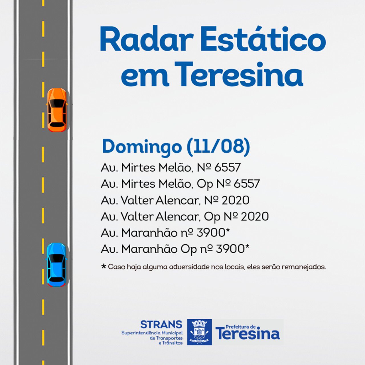 A Prefeitura de Teresina divulgou na manhã deste domingo (11/08), a localização dos radares na capital. Para dar mais transparência aos teresinenses, a lista com a localização dos radares é sempre divulgada nas redes sociais, já que a presença dos aparelhos é importante para diminuir e prevenir o número de acidentes, assim como dar maior fluidez ao trânsito.