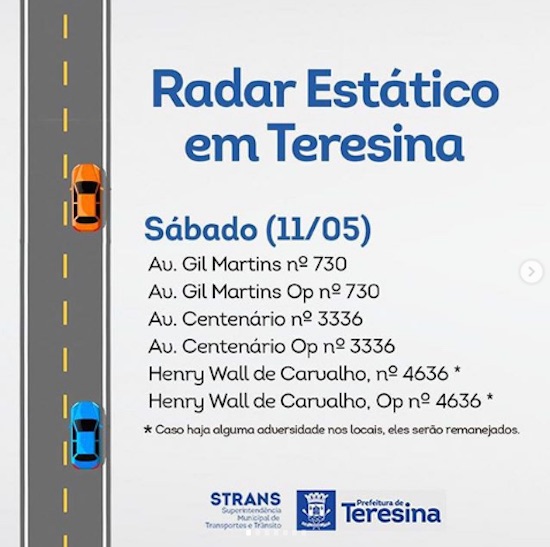 A Prefeitura de Teresina junto com a Superintendência Municipal de Transporte e Trânsito (Strans) divulgou na manhã deste sábado (11/05), os locais onde estão localizados os radares estáticos na capital hoje e amanhã (12). A localização dos radares é encontrada pelos internautas nas redes sociais da Prefeitura.