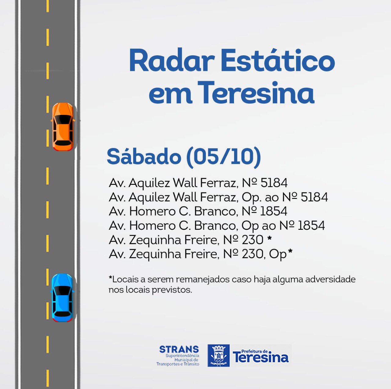 A Prefeitura de Teresina divulgou na manhã deste sábado (05/10), a localização dos radares na capital. Para dar mais transparência aos teresinenses, a lista com a localização dos radares é sempre divulgada nas redes sociais, já que a presença dos aparelhos é importante para diminuir e prevenir o número de acidentes, assim como dar maior fluidez ao trânsito.