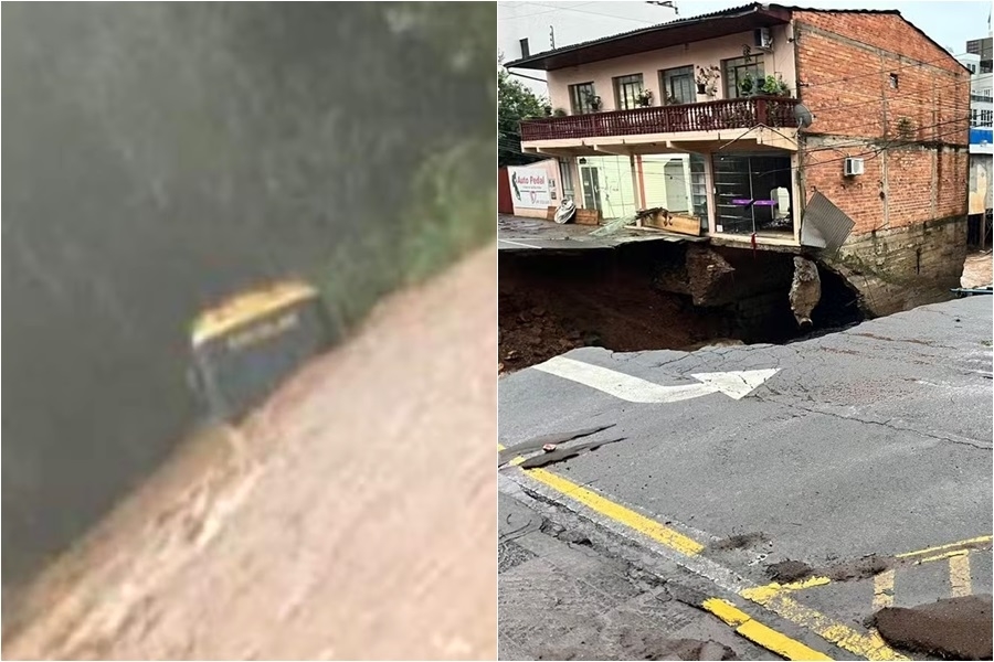 RISCO DE DESABAMENTOS: Um dos danos mais significativos foi registrado por câmeras, mostrando a estrutura de uma residência, que também servia como estabelecimento comercial, sendo engolida por uma cratera que se formou na quinta-feira. O risco de novos desabamentos ainda persiste. No estado, 19 cidades registraram estragos, de acordo com relatório da Defesa Civil estadual das 17h de quinta-feira.