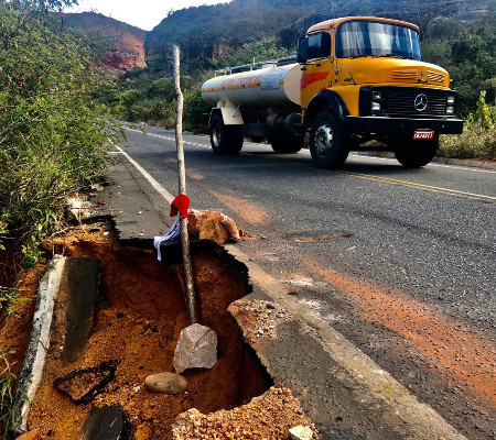 Uma enorme erosão cavou um buraco exatamente embaixo da pavimentação da rodovia num trecho muito sensível para o tráfego dos veículos. Esse pedaço da rodovia é conhecido por ser cortado dentro de uma Serra, o que faz a estrada ficar estreita e sem acostamento.