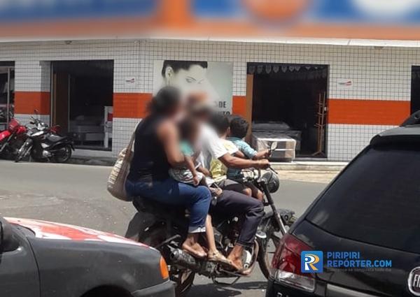 O flagrante foi registrado na tarde dessa segunda-feira (02), na avenida 4 de Julho, no centro de Piripiri. Na situação, uma foto mostra cinco pessoas em uma única moto, mas na verdade são seis, pois ainda há uma criança, na frente da mãe, que aparece somente uma perna. As informações são do Piripiri Repórter.