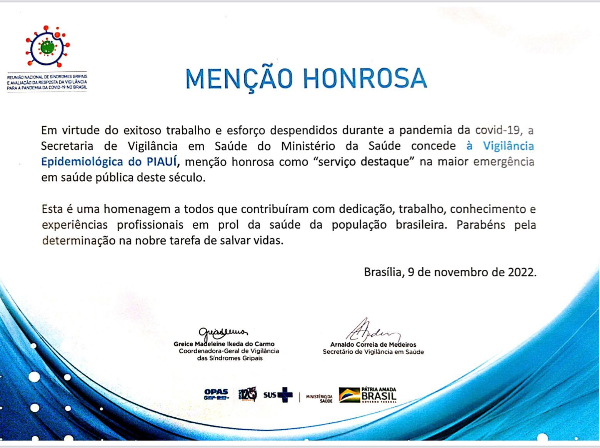 A Vigilância Epidemiológica do Estado do Piauí, recebeu menção honrosa como "serviço destaque" na maior emergência em saúde pública deste século. A honraria foi concedida pela Secretaria de Vigilância em Saúde do Ministério da Saúde em virtude do exitoso trabalho e esforço despendidos durante a pandemia da covid-19.