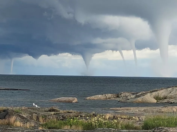 "No fim de semana, ocorreram trombas d'água espetaculares, que agitaram a superfície do mar, na área entre Pyhämaa e Kustav. [Elas] podem ser devastadoras no mar e em terra. Ao mesmo tempo, eram visíveis 7 trombas. A foto foi tirada por um funcionário da Guarda Costeira, em North Åland", descreveu o post.