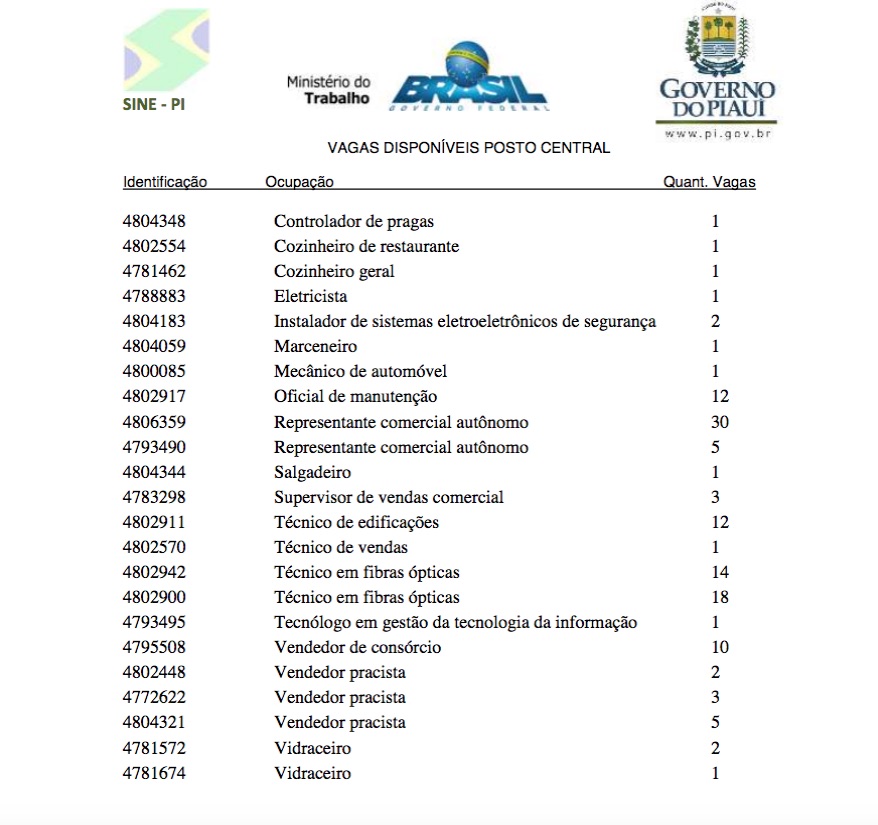 O Sistema Nacional de Emprego (Sine) de Teresina publicou nesta terça-feira (22/01), as novas oportunidades de emprego na capital. Para concorrer a uma destas funções, é necessário ter cadastro em um dos postos do Sine (Centro, Dirceu, Parque Piauí e Espaço Cidadania).