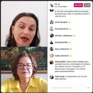 A presidente da Junta Comercial do Estado do Piauí (Jucepi), Alzenir Porto, fez um balanço do funcionamento da autarquia nesse período de isolamento social por causa da pandemia do coronavírus em bate-papo, nesta sexta-feira (24), ao vivo pelo Instagram, com a vice-presidente do Conselho Regional de Contabilidade do Piauí (CRC-PI), Salvina Veras.