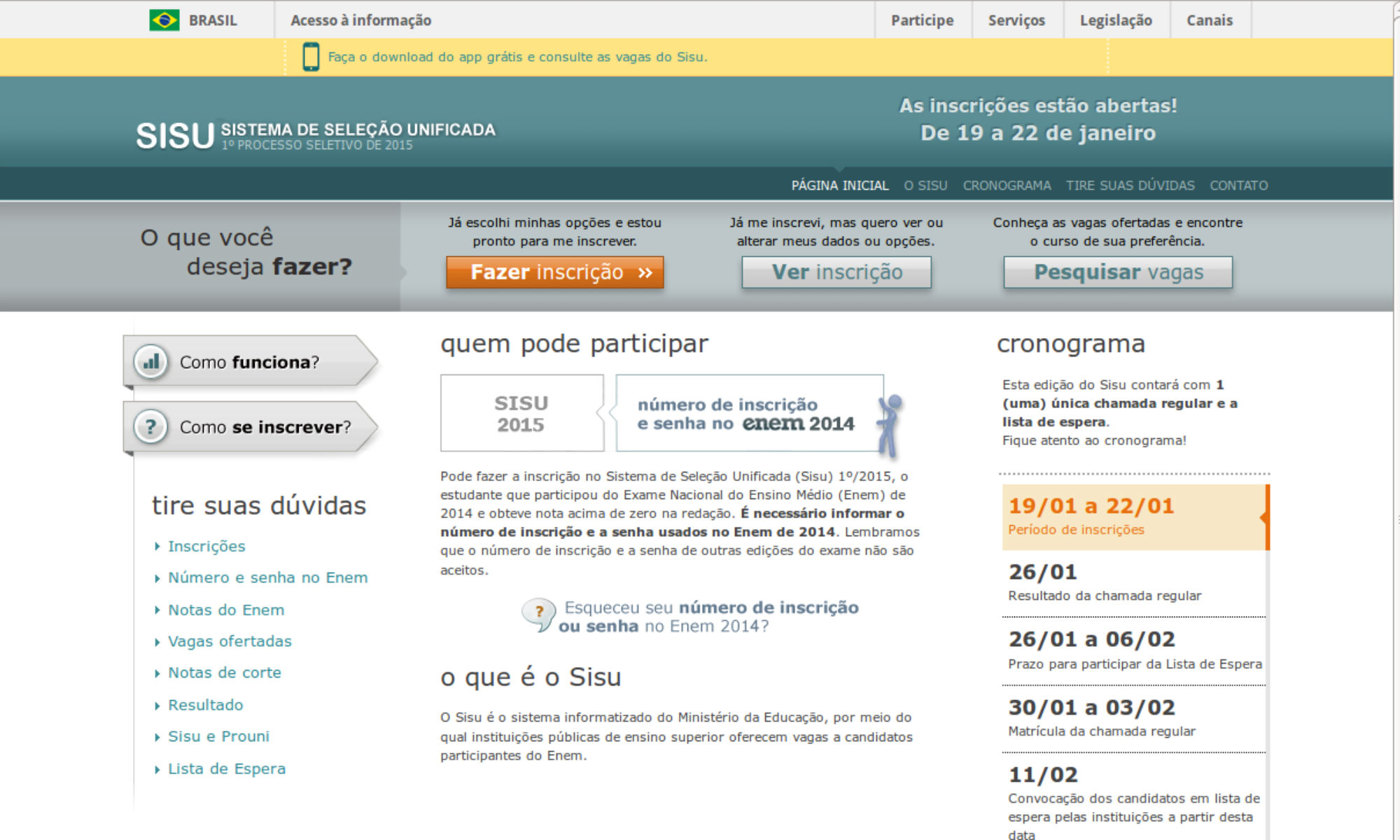 O Ministério da Educação abriu nesta segunda-feira (19) as inscrições para primeira edição de 2015 do Sistema de Seleção Unificada (Sisu), pelo sisu.mec.gov.br. Não há um horário previsto para o início do funcionamento do sistema, segundo o Ministério da Educação. O prazo vai até as 22h59 desta quinta-feira (22). O resultado da primeira chamada regular será divulgado no dia 26 de janeiro.